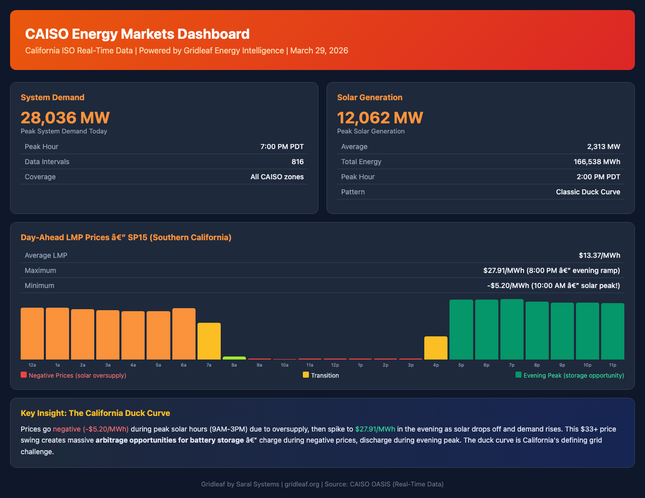 Track California's grid in real time — demand, solar generation, LMP prices, and storage opportunities.